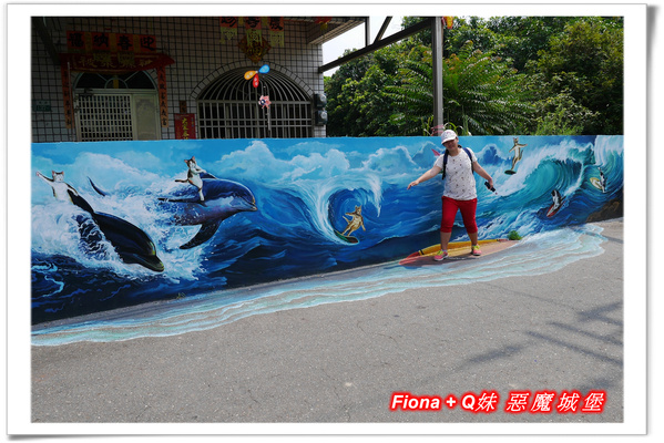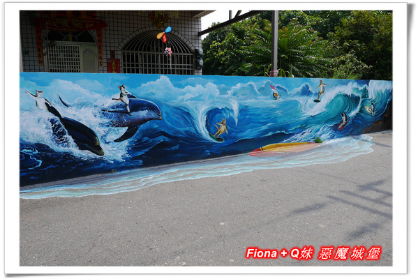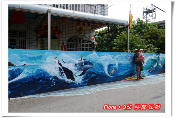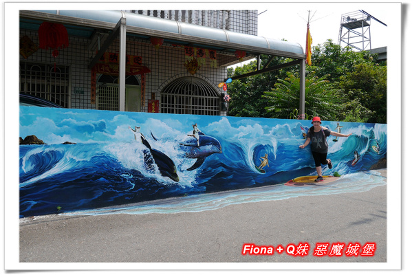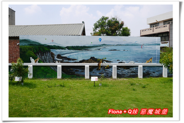 派出所旁的公園裡頭也有一面大型彩繪,擁有無限延伸的海岸線與廣闊的大海,衝浪好手正在玩著風帆,天空還飄來了熱氣球,幾隻貓咪在河堤上欣賞浪花與美景,整個畫面好悠閒好愜意啊 !