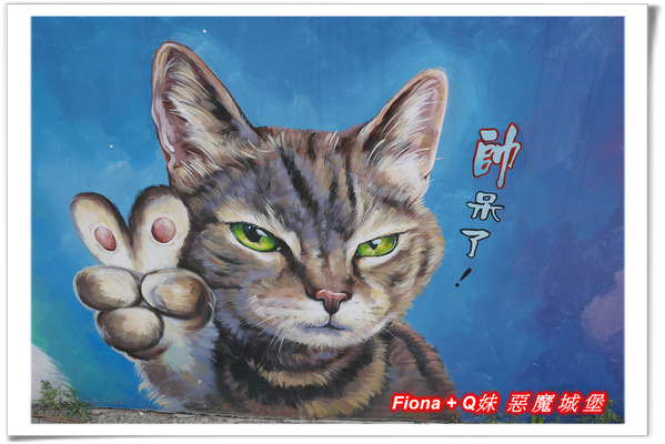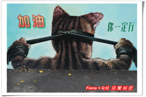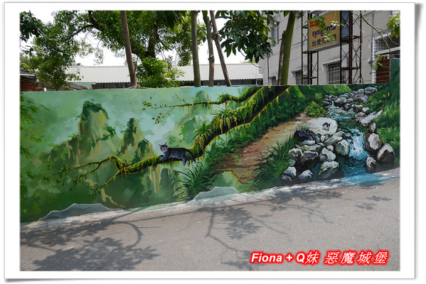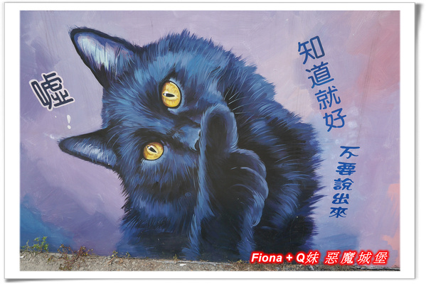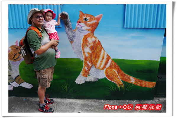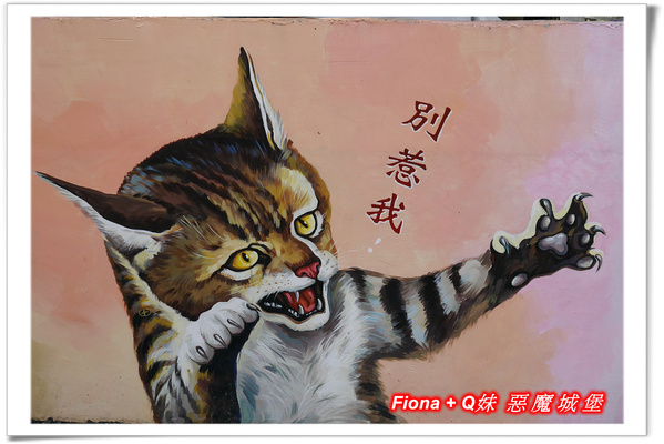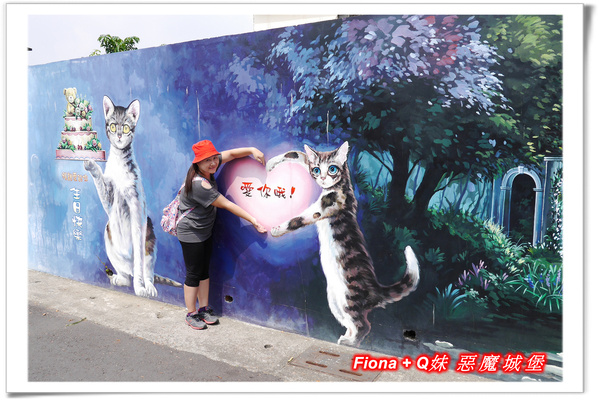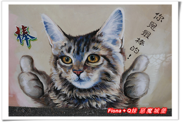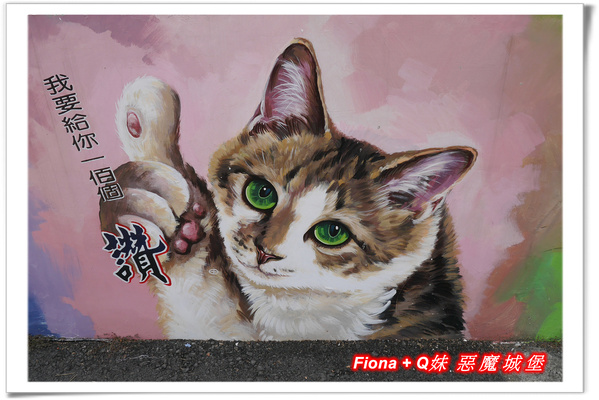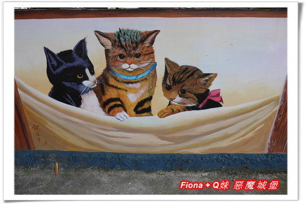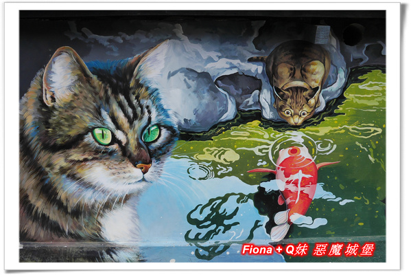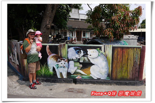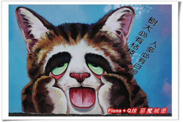 對面大榕樹下的圍牆上,也有許多表情生動與動作逗趣的貓咪們,彩繪旁邊還有文字解說,圖文搭配之下,讓牠們更顯活靈活現,太可愛啦 !