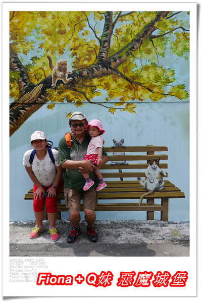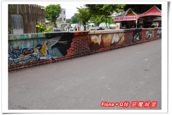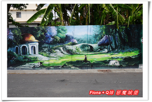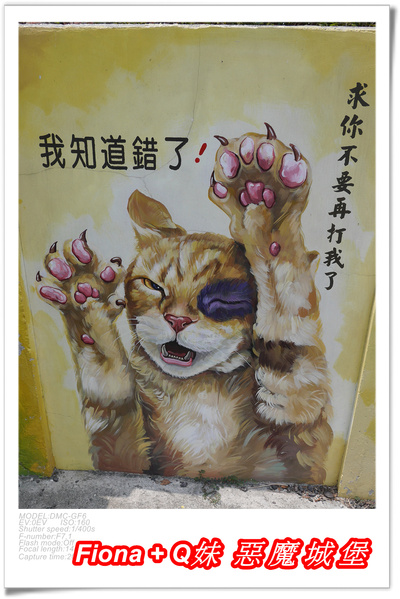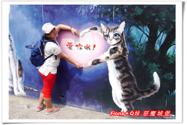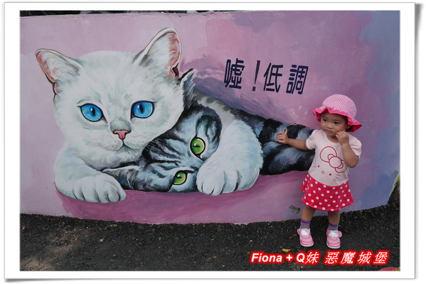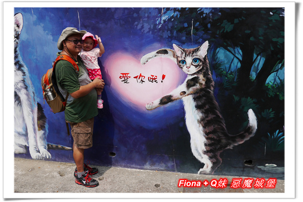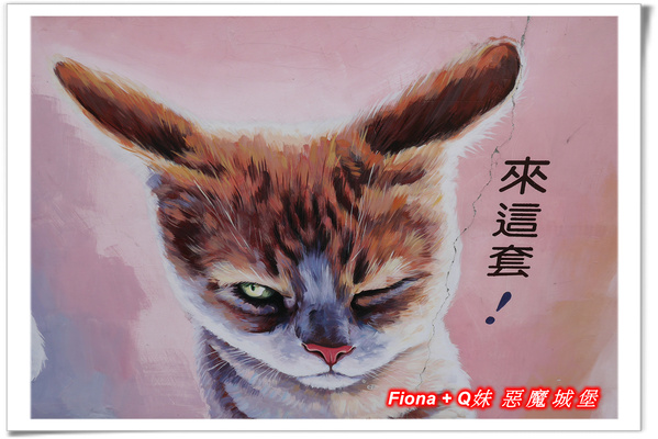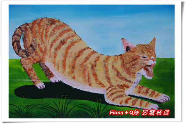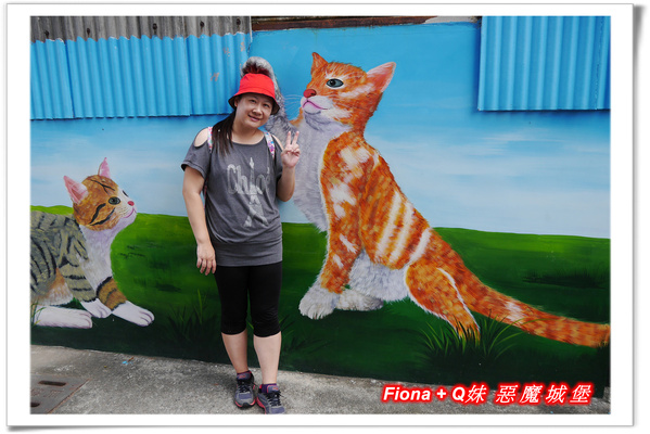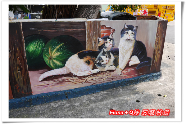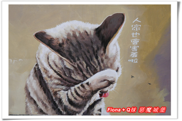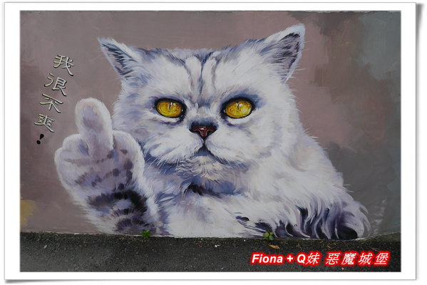 對面大榕樹下的圍牆上,也有許多表情生動與動作逗趣的貓咪們,彩繪旁邊還有文字解說,圖文搭配之下,讓牠們更顯活靈活現,太可愛啦 !