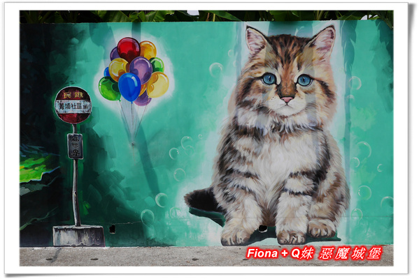 「菁埔社區貓世界」站,到囉 ! 還有隻萌萌低大貓在站牌那等著我們,拉著色彩繽紛的氣球跟牠拍張照,有沒有很幸福的感覺呢 ?
