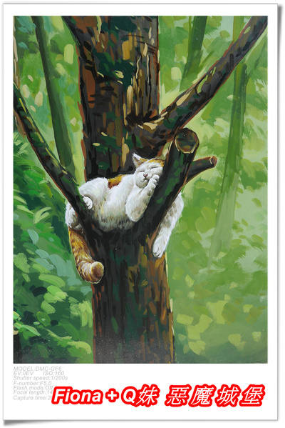 樹上有一隻貪睡的貓咪,牠跟我們家養的小倉鼠好像,都是一團肉球,呵呵,好可愛啊 !