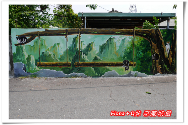 貓森林彩繪的範圍很廣,首先看到在樹枝上玩耍的貓咪,樹枝上還掛了2個盪鞦韆,不過看看後方的景緻,感覺有點像張家界一般的幽谷,若想在懸崖峭壁上玩鞦韆,需要很大的勇氣呢 !