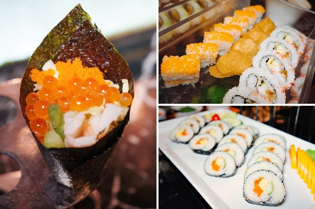 生魚片有鮭魚、旗魚、鯛魚、鮪魚、黃魚,想吃什麼就拿什麼。