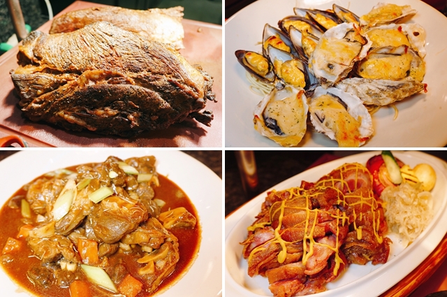 現烤美國牛排、芝士焗烤鮮貽貝、紅酒迷迭香燉羊膝、德國豬腳,