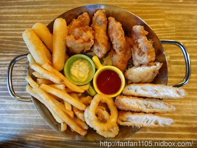 放肆,裡面有薯條、起司條、炸雞、鱈魚、花枝圈,搭配塔塔醬和番茄醬