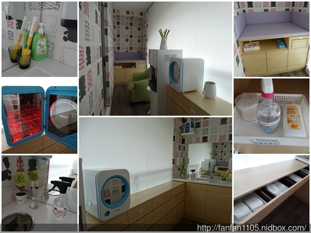 提供奶瓶清潔液、消毒箱、酒精、溼紙巾、尿布、爽身粉、棉花棒,還有讓寶貝能舒適換尿布的尿布台等