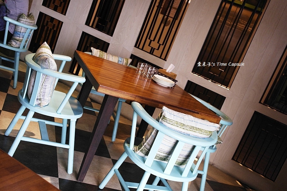 一旁的木質桌加上湖水綠般附帶軟軟背枕的椅子,