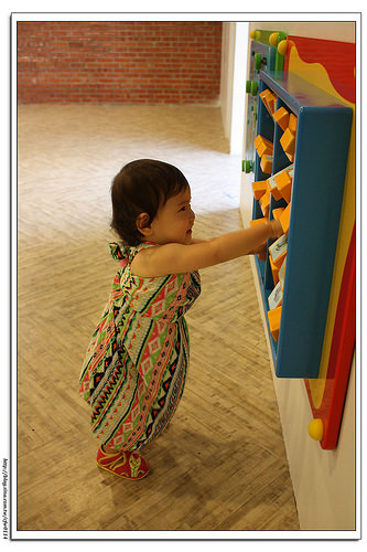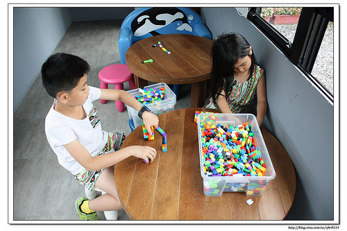 而我們當然要去叮叮車上看一看,叮叮車的一樓是一些小積木玩具區,大概5~8個小孩就會坐滿了,所以我們等其他人走了才來玩耍。