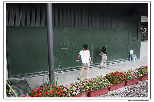 走出外探險,總算看到孩子們可以嬉耍的空間,首先就是這一大面的塗鴉黑板牆。(這個真的還不錯,楚喬的學校穿堂也有一兩面呢)