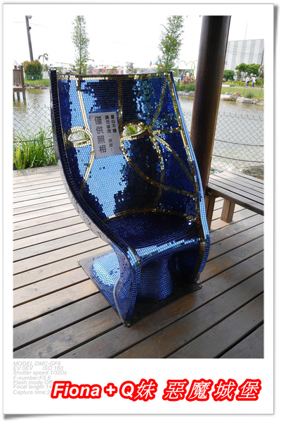 涼亭內有個挺吸睛的裝置,就是閃亮亮的大面具,其實它應該是張椅子來著,但是可能怕損壞,所以只供拍照囉 !