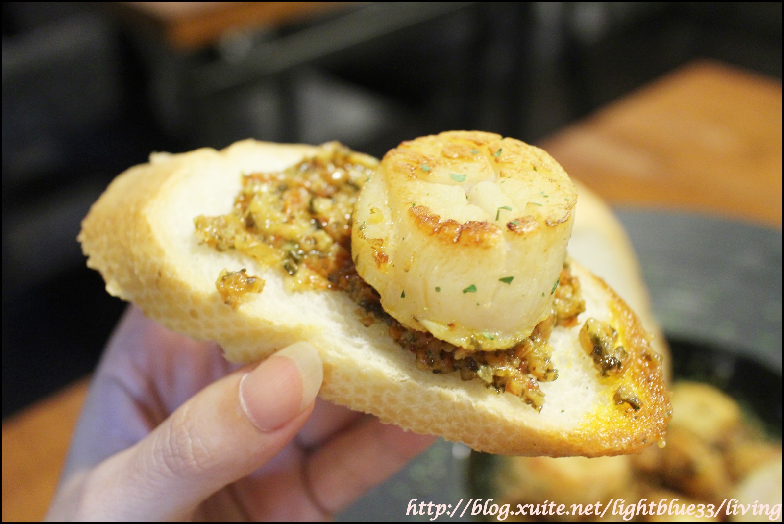 給大家看一下干貝的大小,是非常令人開心滿足的大個頭啊!檸檬奶油白醬跟蔬菜香料一同拌炒,裡頭還混有烤得香酥的麵包丁,很適合抹在麵包上,真的很開胃啊!