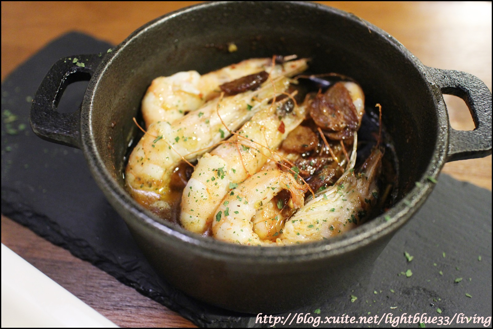 這是開胃菜「西班牙蒜味蝦」,據說點菜率很高喔,上桌時還咕嚕冒泡,蒜頭雖然看起來泡在油裡面,但是卻不油膩,因為蒜頭經過香煎後再放入橄欖油,更是引出了焦香味跟蒜香,橄欖油因此也跟著變成不同的香氣,建議除了蝦子之外也可以挑幾片蒜片一起吃。