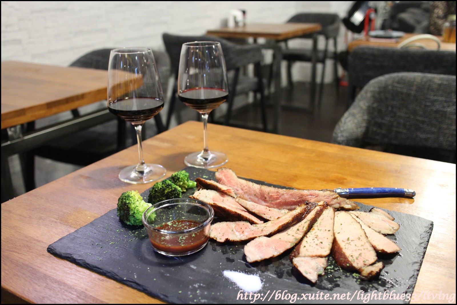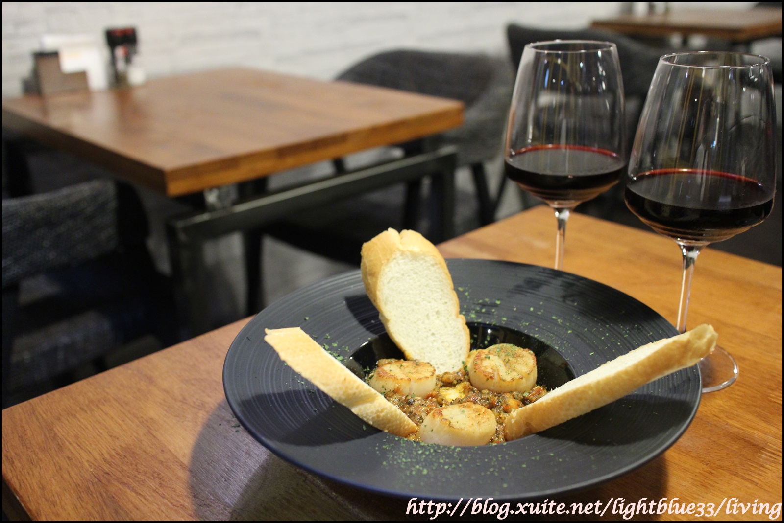 接著是擺盤跟口感都很厲害的北海道生食級干貝佐檸檬白酒奶油醬,另外服務人員也還推薦香蒜奶油蘑菇、焗烤蝦蟹炸彈,這不多來幾次怎麼行?紅酒是服務人員推薦,有略重的單寧味,很適合搭配排餐跟蒜味蝦,大家也可以依據自己點的菜請服務人員推薦適合的酒款