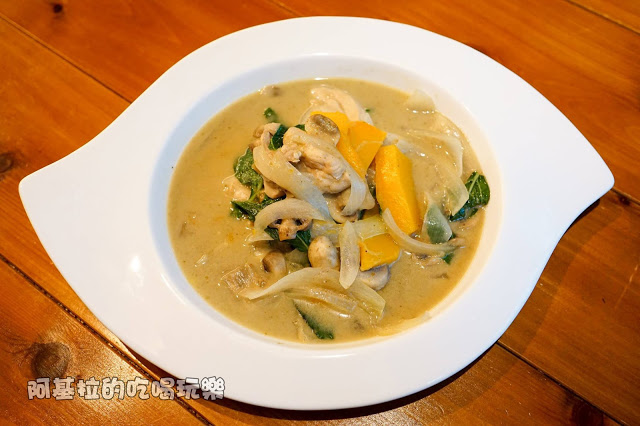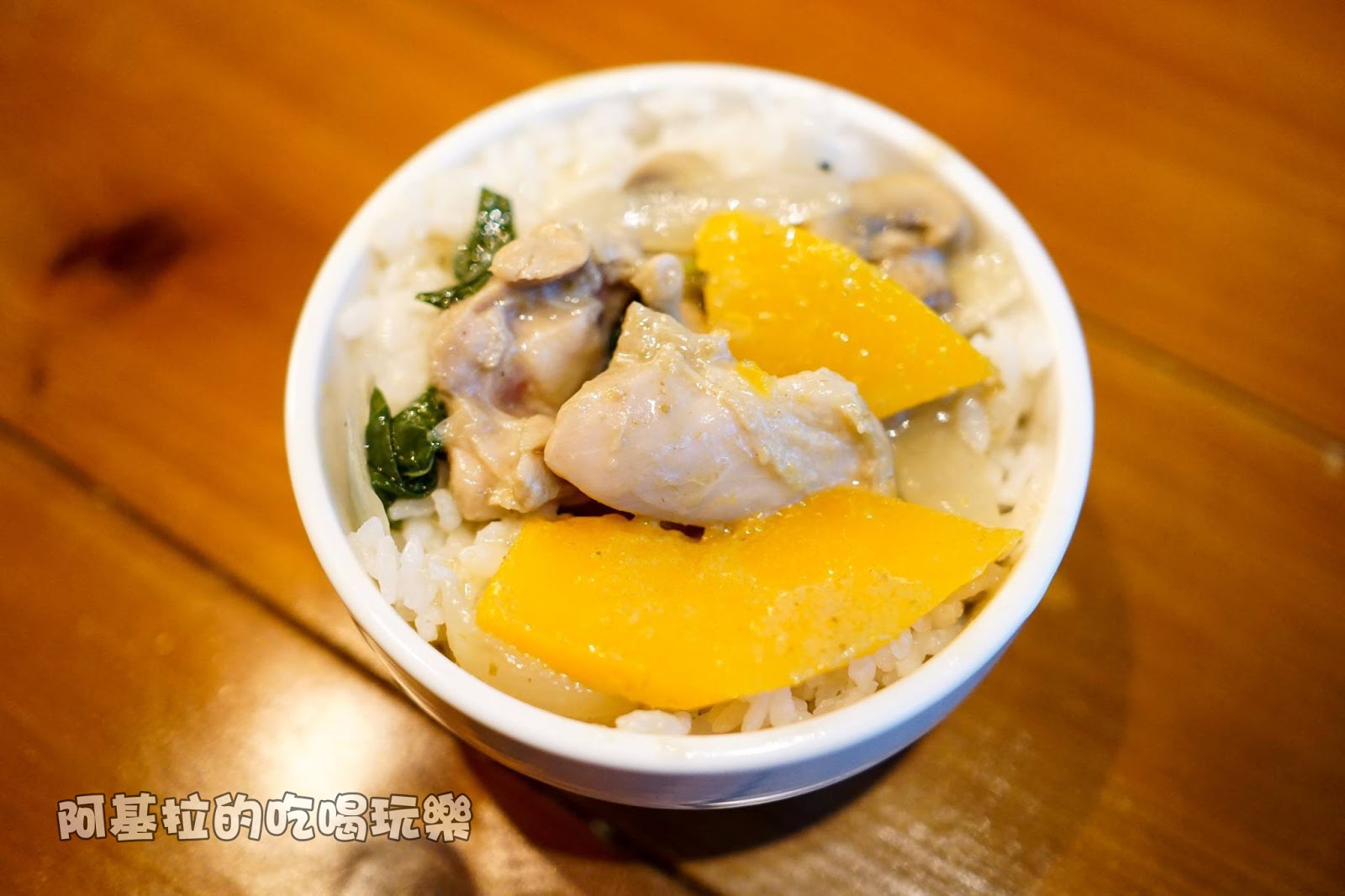 ▲有別於日式咖哩的濃稠口味,雖然醬汁比較稀薄,但是咖哩的香味和鹹味仍然足夠,而且有一定的辣度,相當刺激食慾,另外有「南瓜、洋蔥、九層塔、蘑菇、雞肉」做為食材,搭配白飯一起吃,整體的口感相當不錯。