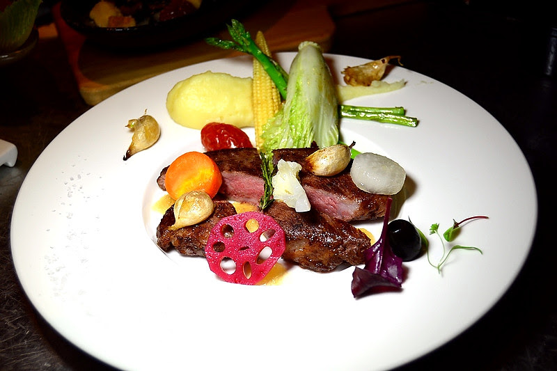 傳說中伊比利豬果然不同凡響,店家將肉排依紋路及油花分布狀況進行切割,讓入口的每塊肉不會有過柴或太油,6.7分的熟度,口感和牛肉不分軒輊,連配菜都比照牛排辦理,搭配甜甜醬汁和鹹鹹的海鹽,讓味蕾感受不同風味