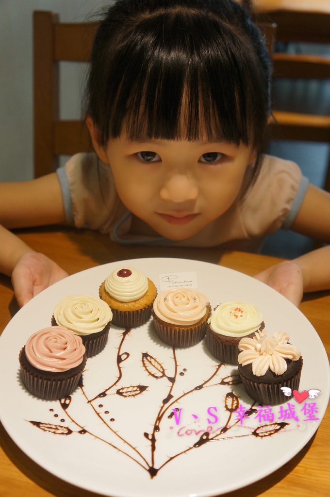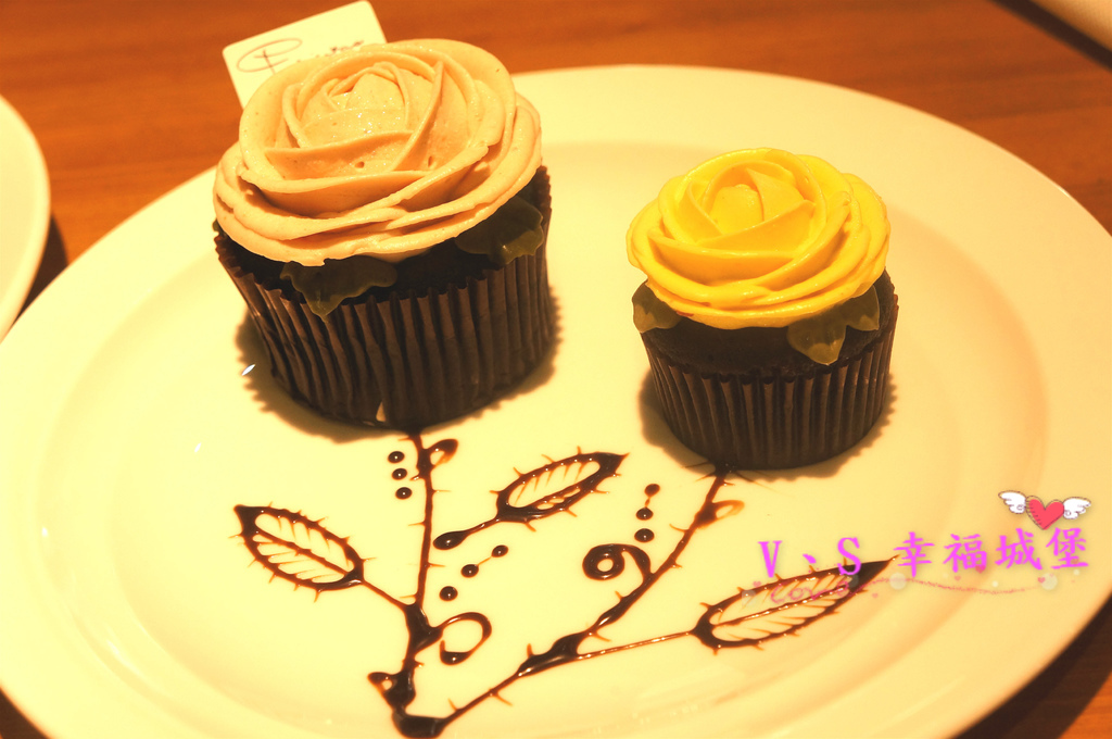 老闆娘的巧口竟先在磐子上畫上葉子,在擺上我所選得杯子蛋糕,真的好美喔 !!!