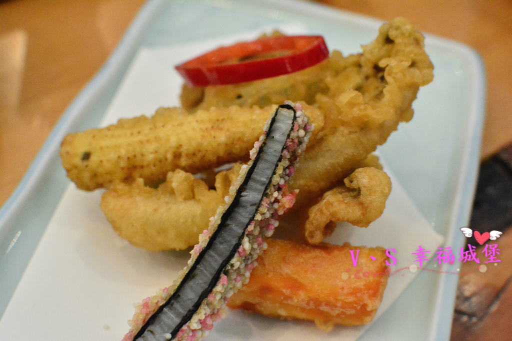 店家自製豆皮包蟹肉卷、秋葵、烤魚、地瓜,沾上一旁的水果醋,讓炸物吃起來不油膩。