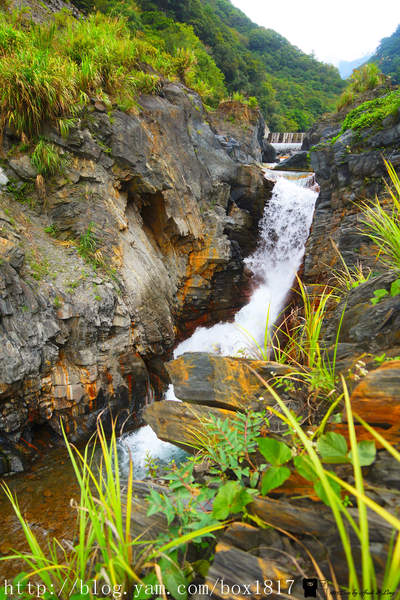 瀑布前有漂亮的巨石,山壁有部份是橘色的,這和我們之前在武界部落的摩摩納爾瀑布看到的顏色相似,