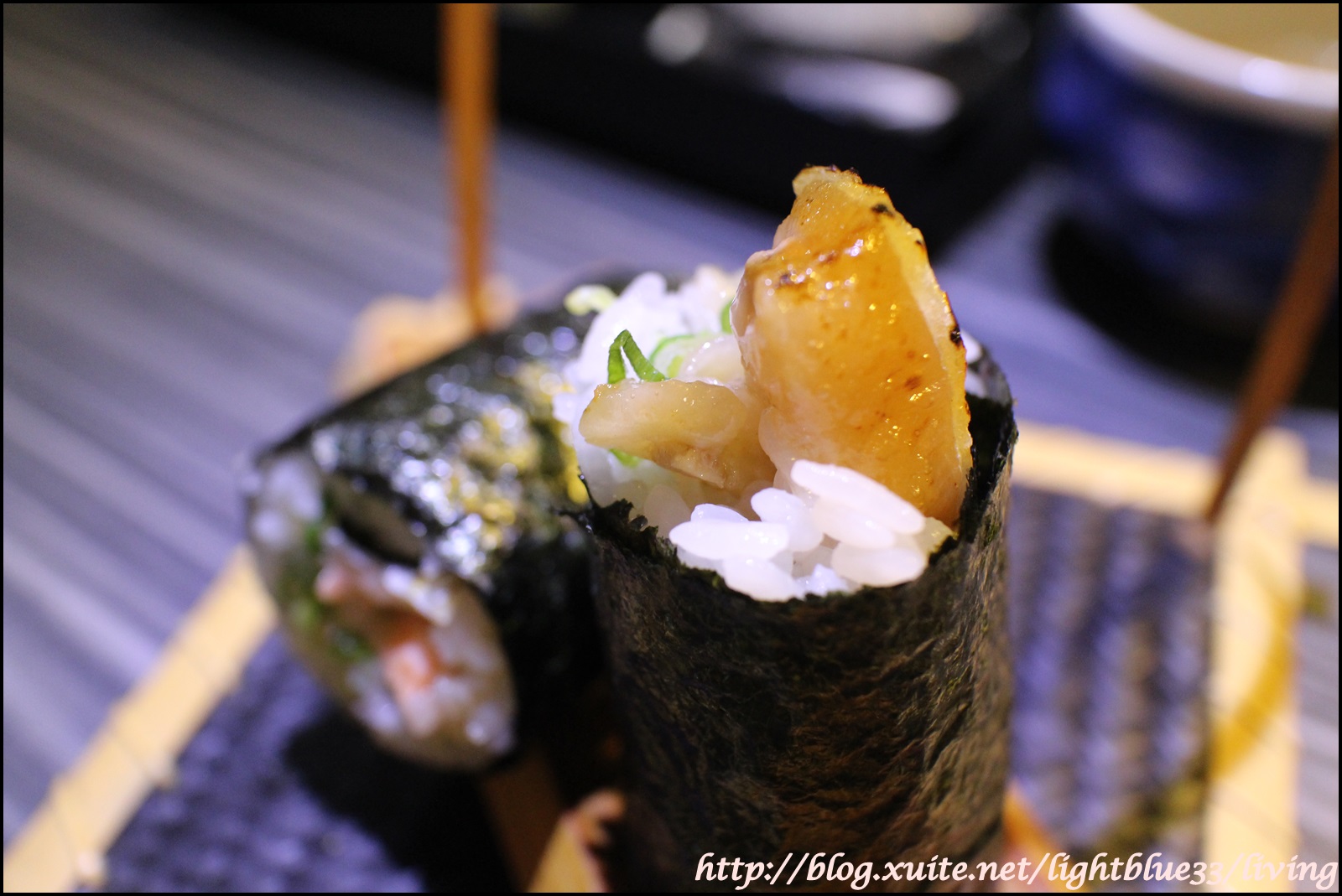 鮭魚肚有極豐富的油脂,經炙燒過後完全釋放為誘人的香氣,大器的魚肉厚度也因為炙燒的關係,所以一入口就很快的化開,不過因為很大一塊,所以連已經切成一半的大小還是要分兩口才能吃完