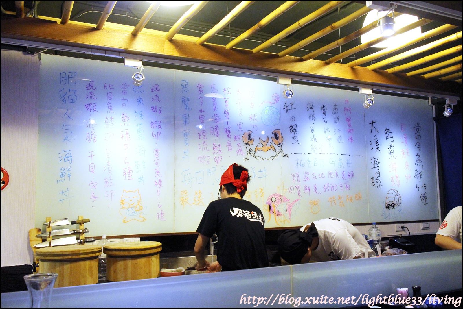店內座位不算太多,有幾張四人跟兩人桌,還有這一排板前區,這天是下著大雨的週間晚上,結果七點半的用餐時間竟然還是一直都在客滿的狀態,因為不開放訂位,想吃的人還是要儘早來報到比較保險