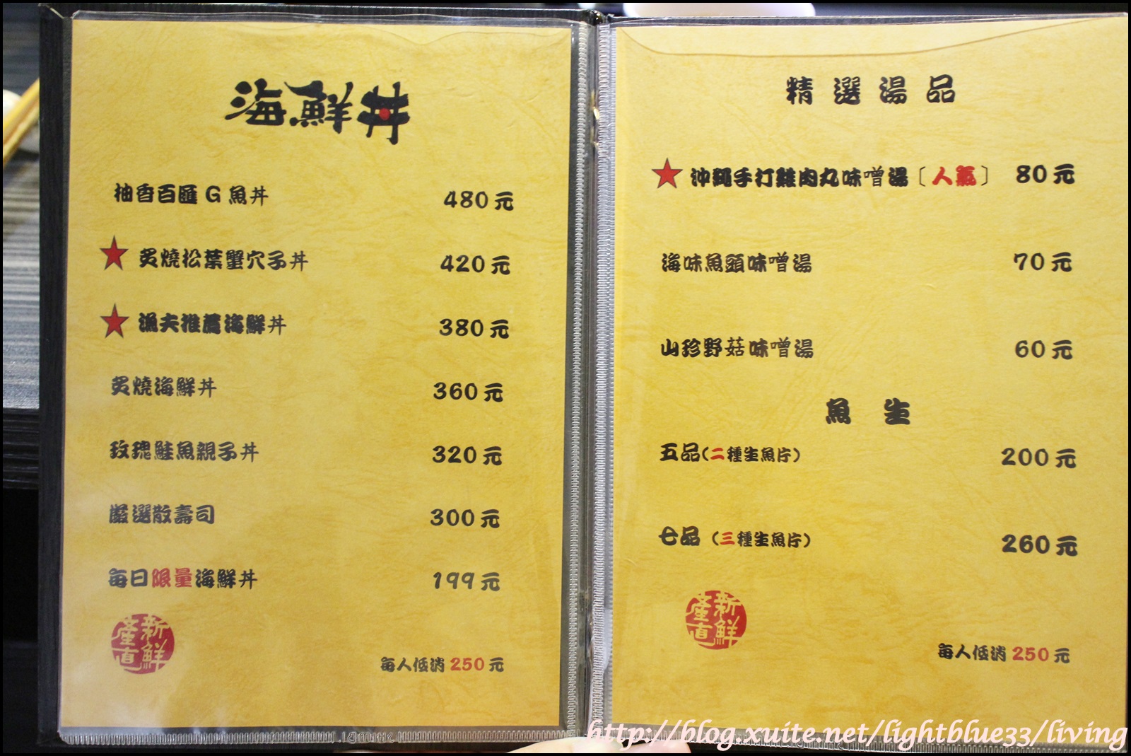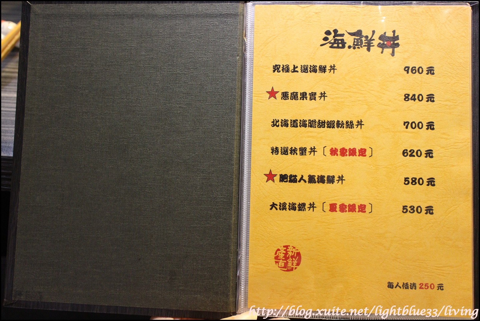 第二頁有平價一點的選擇,甚至有每日限量海鮮丼才199元呢!順便分享一下我自己也有的疑問,那就是「肥貓推薦海鮮丼」跟「漁夫推薦海鮮丼」有什麼不同呢?前者有大約十種左右的海鮮,現流蝦、干貝、海膽、穴子及當季魚種五至六種,而後者是大約八種海鮮,但是就以當季魚種為主,大家可以根據自己的預算跟想吃的內容來做選擇
