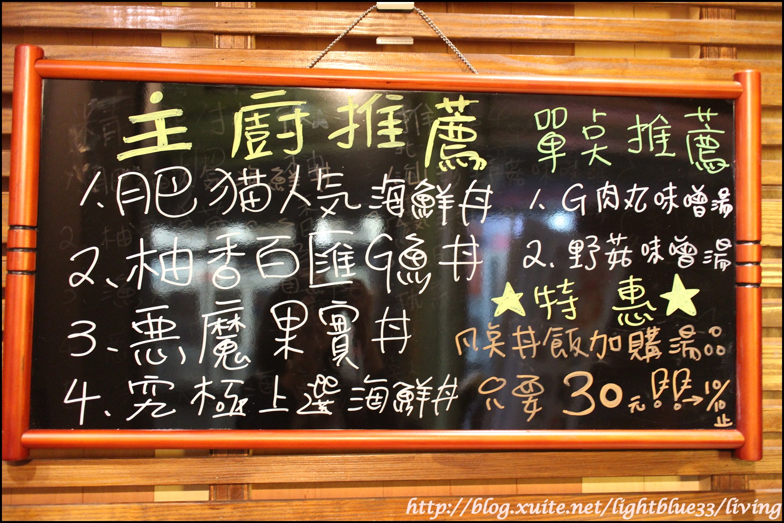 肥貓無夫提供很多種海鮮丼組合,拿不定主義的可以參考一下外頭小黑板的店家推薦,到10/10止,只要點丼飯就可以享有30元加價夠湯品的優惠,原價要80元超大一碗,非常划算,等等給大家看實品