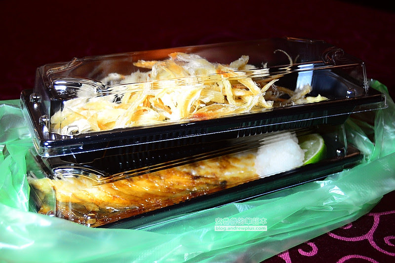 ▼整套套餐吃下來實在太飽了,最後只好把魟魚乾和鯖魚打包回家當下酒菜,外帶盒也相當的講究哩!!