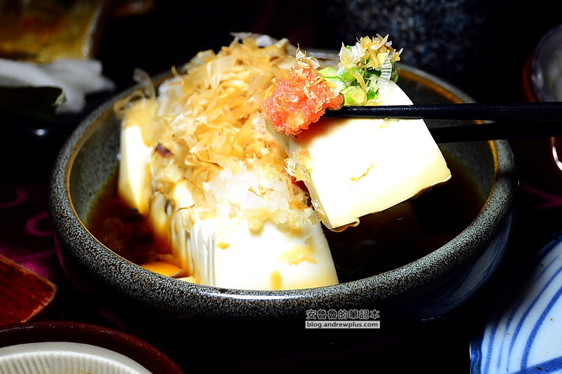 軟嫩的豆腐泡在特調的醬汁裡,上頭再舖上蘿蔔泥、辣味明太子、青蔥及大量柴魚片