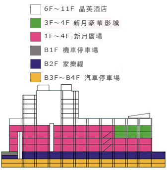 新月廣場一共有15層樓,B3F~B4F是地下室停車場