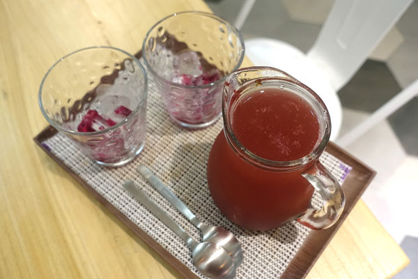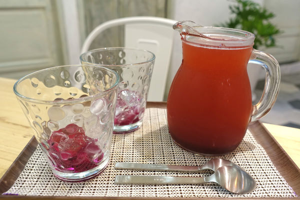 整壺泛著美麗艷紅色的氣泡飲,沒摻半滴水唷。