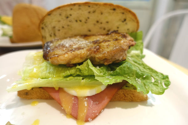 烤至酥脆的吐司裡夾有雞腿排、生菜、水煮蛋、番茄和火腿~
