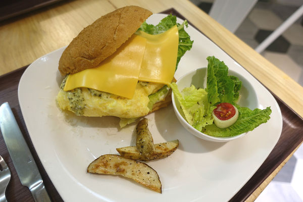 依序夾著起司片、歐姆蛋、生菜、番茄片,而且還是有水煮蛋,