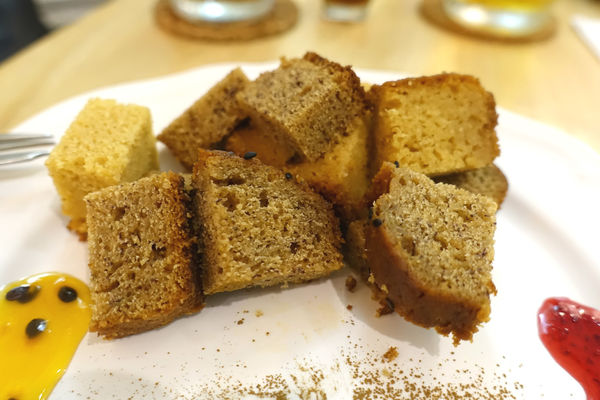 金黃淺色的是柑橘蛋糕、深色有芝麻的則是香蕉蛋糕唷。