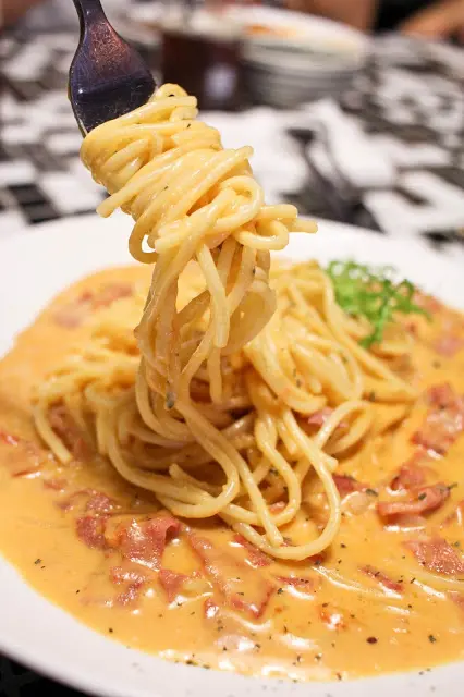 ▲義大利麵的醬料口味有五種:紅醬、白醬、泰式酸辣醬、橘醬、青醬,其中的橘醬是獨家的口味,建議要點來吃看看。另外,食量大的人不用擔心會吃不飽,因為可以免費加麵,光是這一點就吸引了不少人來吃。