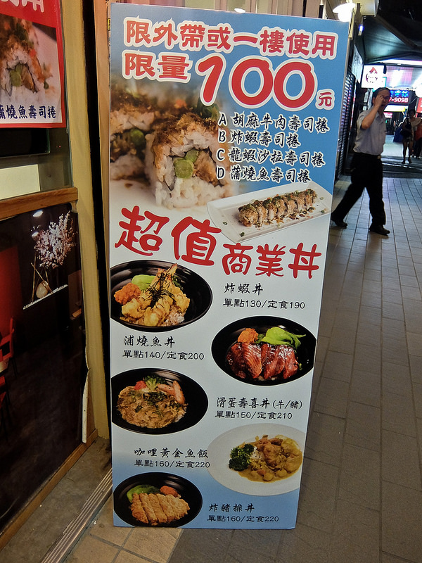 店門口有外帶的平價超值商業丼標示, 蠻划算的