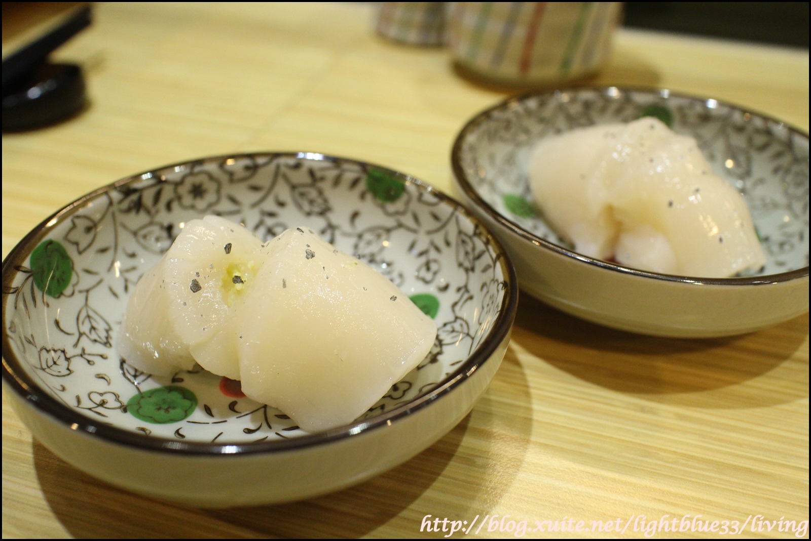 沒想到第二道就是干貝,而且還是生食級的高級干貝,作成握壽司上桌,師傅僅簡單撒了些夏威夷黑鹽,建議我們直接吃不必沾芥末醬油,一入口果然就收服了我,干貝底下已抹有芥末,味道很鮮明,卻又令人欲罷不能,以後我沒辦法再吃冷凍干貝了啦!