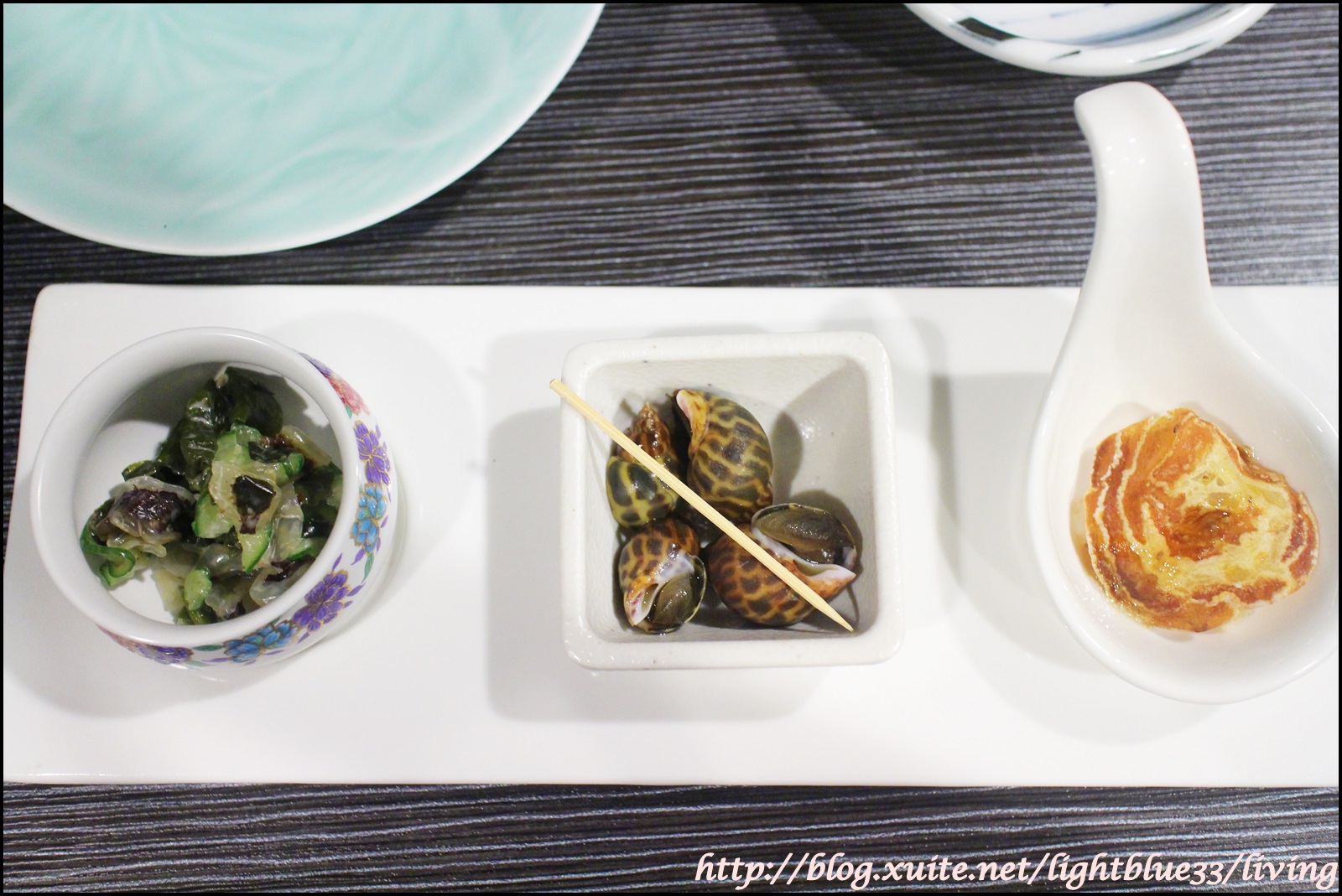 先上桌的是小菜三品,服務人員有特別叮嚀由左吃到右的順序品嚐,依序是脆度跟調味都很爽口的海蜇皮、小小一個但是口感極佳又可以體驗用牙籤取食樂趣的野生螺,最後是干貝加柑橘片,沒想到干貝竟然跟清香爽口的柑橘這麼搭