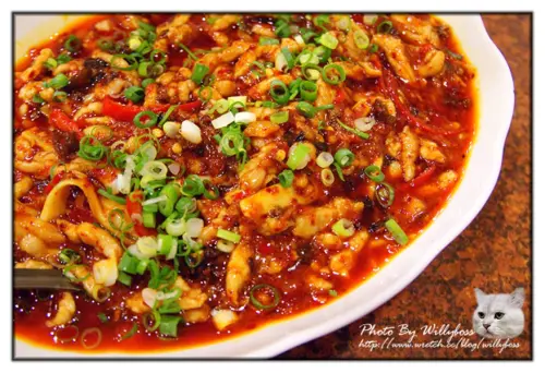「川味烤魚」選用一斤半以上的頂級七星鱸魚,肉質鮮美無土味,魚肉烤過後,外皮脆內軟嫩有韌性,淋上劍筍、馬鈴薯片、蓮藕片、甜椒、小黃瓜大火拌炒的辛香的養身辣炒料,不但肉質不軟爛,醬料收汁後,後味麻辣帶勁,緊緊滲入魚肉之中,品出多層次的美饌口感。相傳四川名菜「烤魚」,是三國時代孔明用來慰勞軍中將士的佳餚,大廚也特地去四川學藝,希冀帶回最道地的行家風味。
