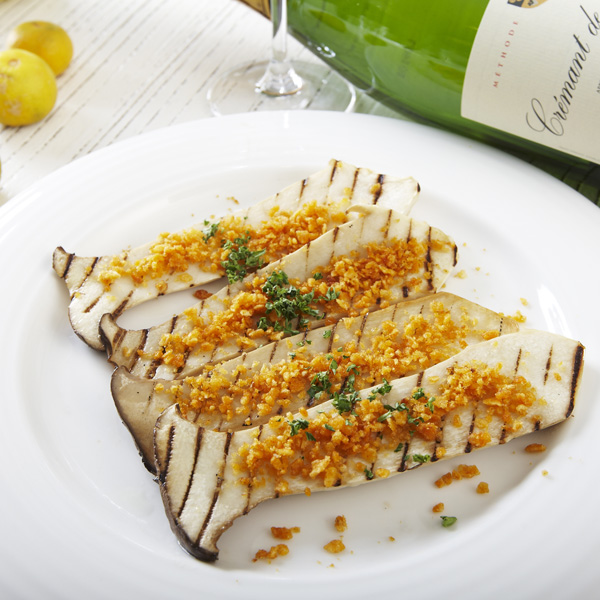 軟嫩多汁的杏鮑菇,撒上以黃薑醃過的馬鈴薯,加入海鹽後的烤乾,再以巴西里提點香氣,除了鹹香風味之外,也帶有酥脆口感,是風格獨具的開胃前菜。