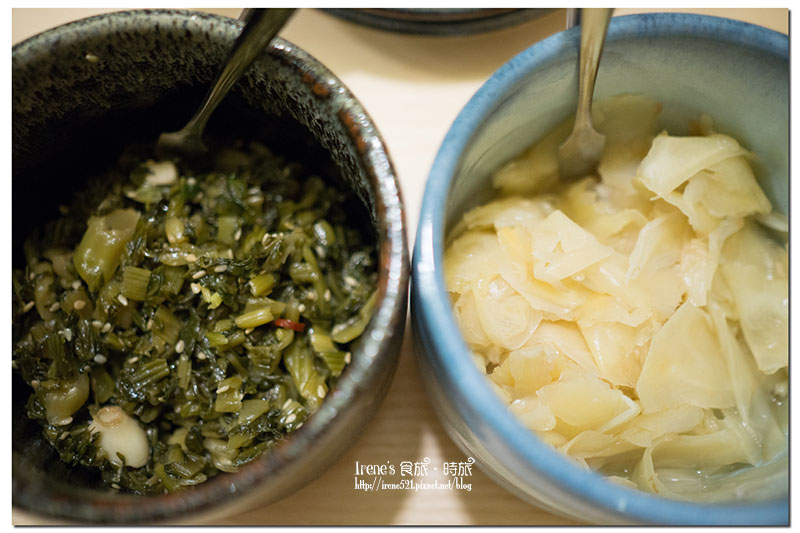 桌上有兩款免費取用的小菜,另外調味料有一瓶七味粉。