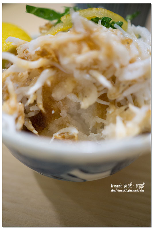滿滿的吻仔魚尖成一碗,撥開後底下大部分是白蘿蔔泥,跟上頭的醬以及吻仔魚攪拌均勻食用;