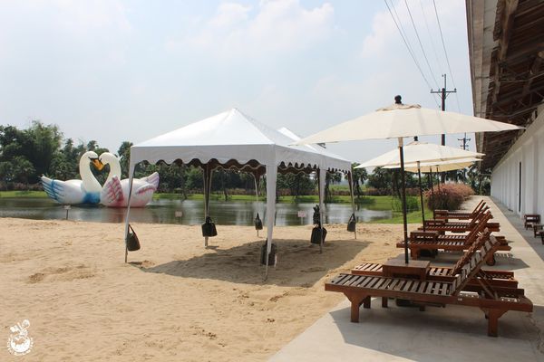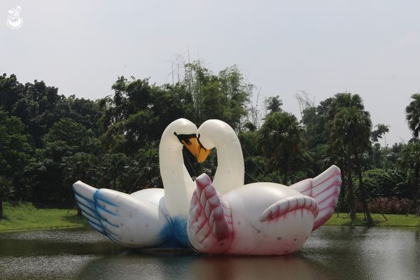 ▲這裡沒有戲水區,只能在沙灘上玩耍,之前池中為黃色小鴨,現在變成兩隻天鵝 (腦海不自覺響起:戲弄綠波~鵝兒快樂~昂首唱清歌 ~♫ )