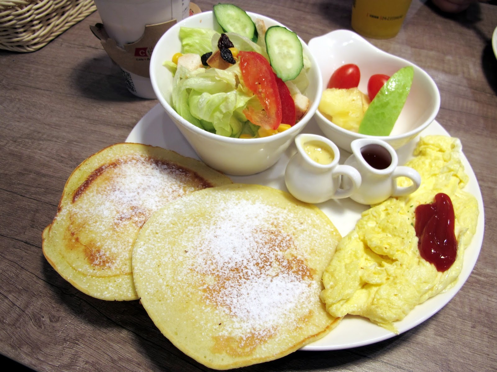 有著PANCAKE+蜂蜜+蔬食沙拉+美式炒蛋x2+季節水果