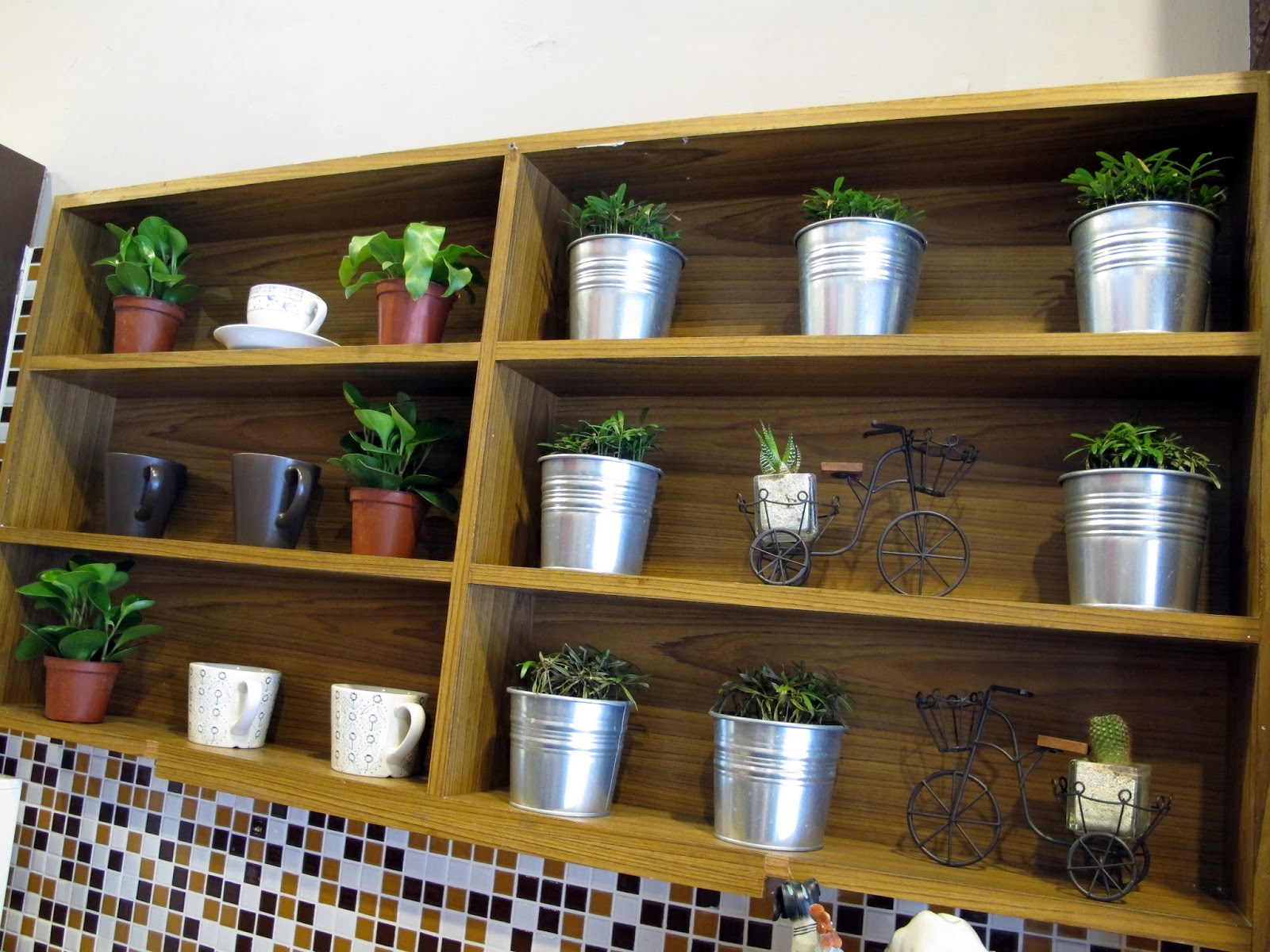 延續店外綠益盎然裡頭也用著小盆裁裝飾著牆面