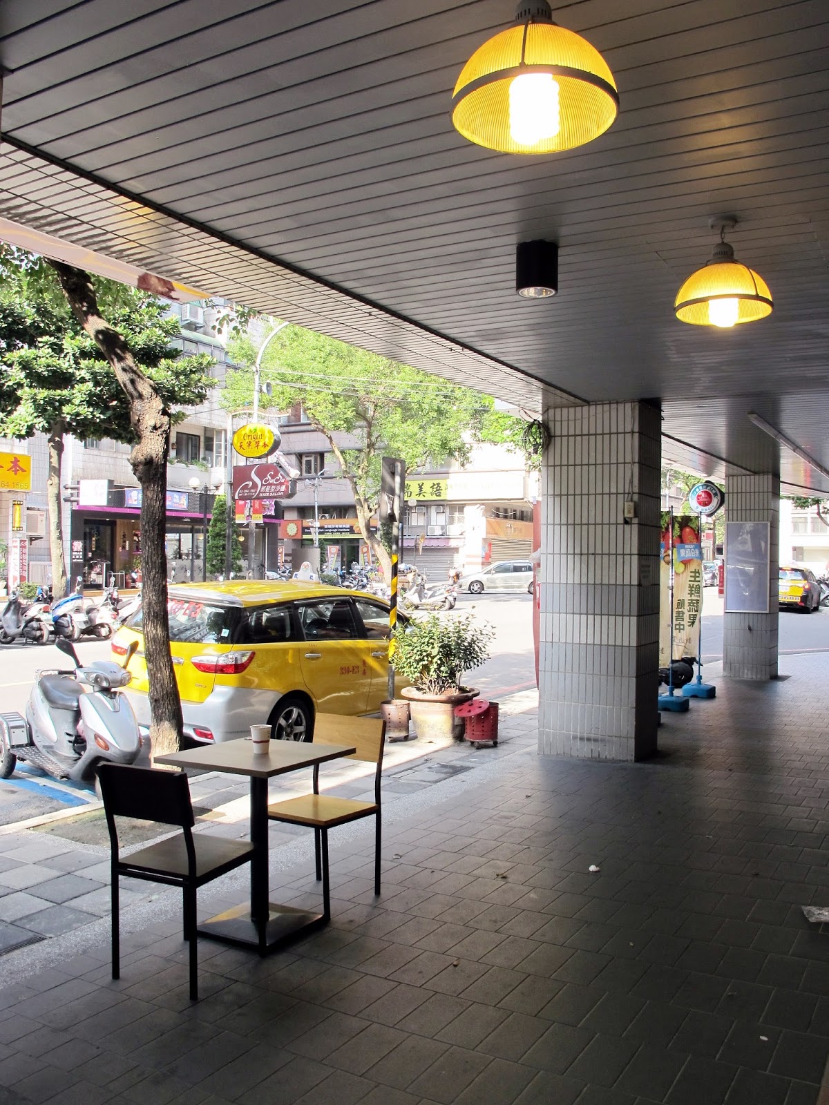 騎樓間擺放著桌椅當成戶外座位區