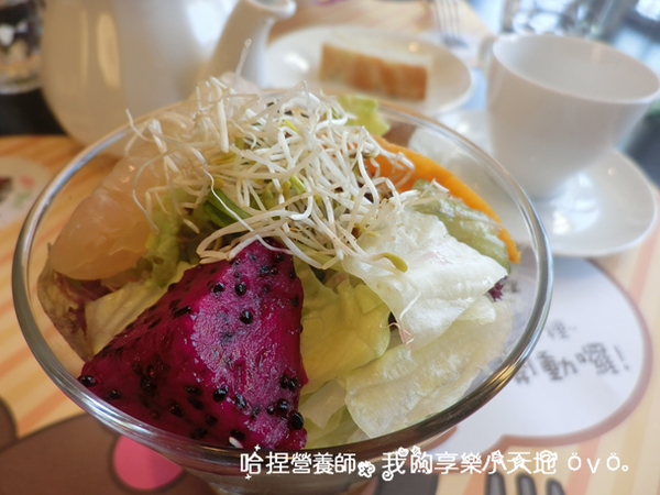 餐前沙拉的生菜種類繁多,還有水果入菜,搭配清爽的油醋醬,吃起來鮮甜開胃,份量又不會多到吃不完,拿捏的剛剛好!