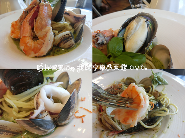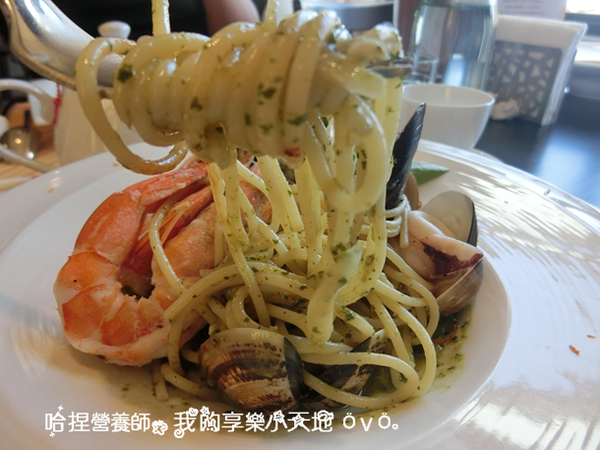 這是一道奶香味較重的靑醬義大利麵,滿滿的海鮮有已經剝好殼的大蝦子還有九孔、蛤蜊和花枝,超澎湃的!