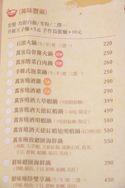 有著好口碑的萬客什鍋,原在漢口店就是相當火紅的石頭火鍋專賣店,最著名的鍋物就是會噴火的燒酒雞鍋 、酸菜白肉鍋、麻辣鍋系列等。