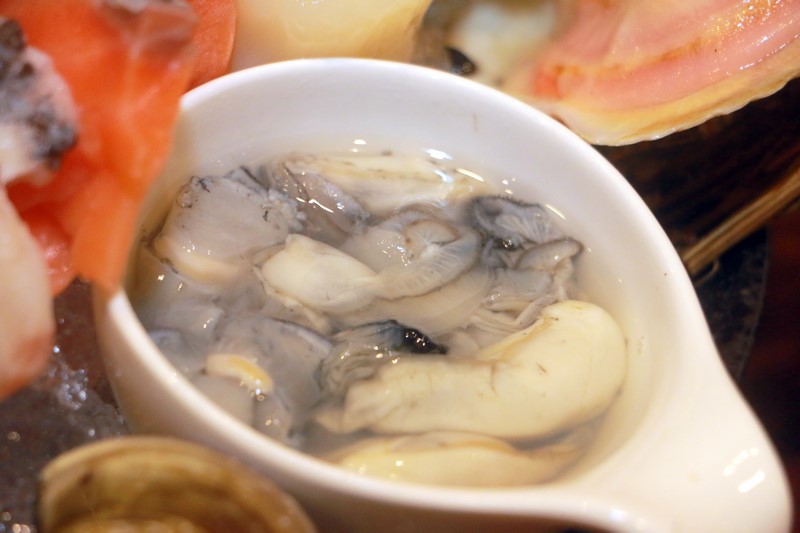 裡面有明蝦、大草蝦、大天使紅蝦、龍膽石斑、鮭魚、干貝、鮮蚵、蛤蜊、扇貝、花枝等食材,相當豐富。
