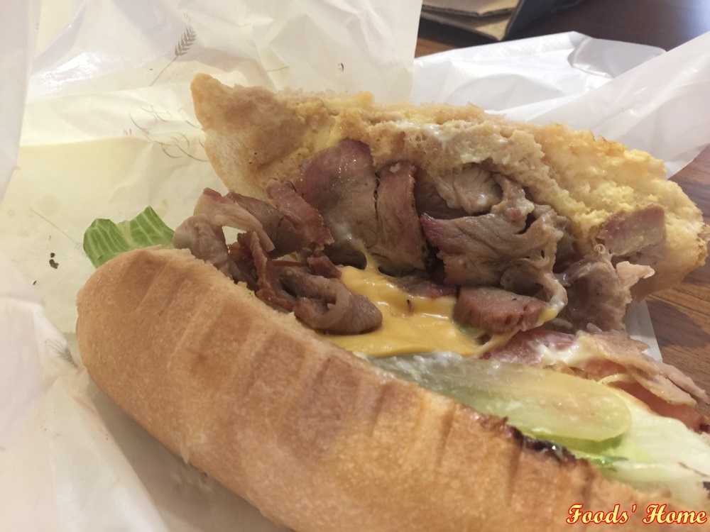 私釀叉燒起司古巴,NTD90,打開時其實有點失望,份量並不大,麵包不若電影,採用的是小的法國麵包,外皮酥脆,裡頭夾有叉燒、生菜、酸黃瓜及起司,叉燒量OK,整體來說味道普通,叉燒不鹹,起司似乎是常見的起司片,酸黃瓜則有提味的效果
